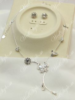 Украшения для невесты Jewardino Sposa K010902 Оригинальный комплект свадебной бижутерии воплощает дизайнерские идеи. На тонкой плетеной цепочке серебристого оттенка сверкают стразами миниатюрные цветы. В центре свадебного колье - нежная бабочка с крыльями из кристаллов. Сережки-гвоздики в виде стилизованных цветов подойдут невесте, которая планирует прическу, открывающую уши. Пикантные украшения украсят свадебный образ в авангардном, романтическом, винтажном стиле. В комплект входит: колье, серьги None