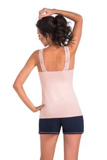 Легкий женский пижамный комплект Klaudia состоит из майки на широких бретелях и шорт. V-образный вырез горловины декорирован кружевом. В комплекте: майка, шорты. None