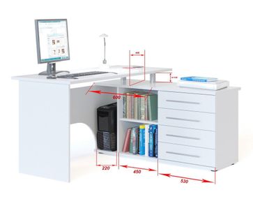 Угловой компьютерный стол КСТ-109 правый с двумя рабочими поверхностями. Основная столешница имеет ширину 1400 мм, позволяя разместить компьютер и рабочие материалы. На малой столешнице — 1200 мм, удобно держать под рукой книги, папки, канцелярию. Стол оборудован тумбой с четырьмя ящиками, открытыми полками и нишей под системный блок. Такая модель компьютерного стола позволяет организовать функциональную рабочую зону как в домашнем кабинете, так и в офисе. Внутренний размер ящиков — 456 х 346 мм. Размер ниши под системный блок (ВхШхГ) — 565 х 220 х 440 мм.
