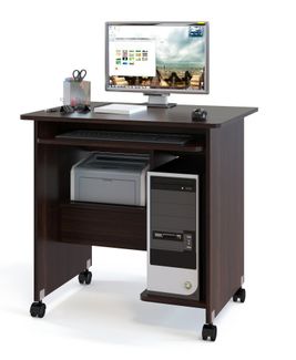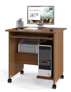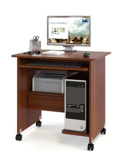 Компактный компьютерный стол на колесиках подойдет для работы как за ноутбуком, так и за полноценным компьютером. На внутренних полочках можно удобно расположить системный блок и даже небольшой принтер. Размер полки под принтер составляет 278 х 396 мм. Высота полки под принтер составляет 278 мм. Под ней находится выдвижной ящик. Под столешницей располагается полочка под клавиатуру. Расстояние от нижней полки под системный блок до полки под клавиатуру составляет 550 мм. Изделие выполнено из ЛДСП.