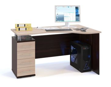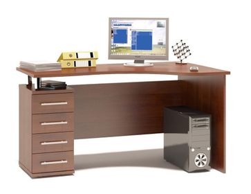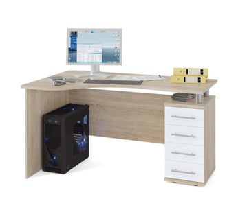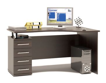 Эргономичный компьютерный стол вместе с тумбой с выдвижными ящиками. Столешница имеет анатомическую форму и изготовлена из высококачественного ДСП отечественного производства толщиной 22 мм, отделана кромкой ПВХ 2 мм. Ширина столешницы по узкой стороне — 560 мм. Задняя стенка тумбы сделана из ДВП серого цвета. Стол может быть в правостороннем или левостороннем исполнении (ориентация по расположению тумбы).