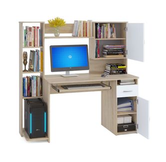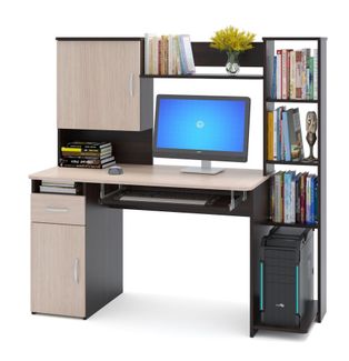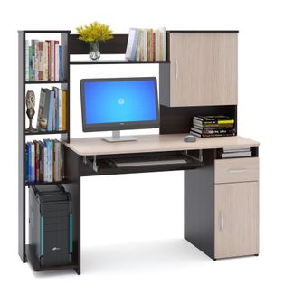 Удобный компьютерный стол с большим количеством полок, прекрасно подойдет для организации места для учебы. В боковом стеллаже на нижней полке можно разместить системный блок. Стол оборудован выдвижным ящиком и полкой для клавиатуры, которую можно не устанавливать, если вы планируете работать за ноутбуком. Столешница изготовлена из ЛДСП отечественного производства толщиной 16 мм, отделана кромкой ПВХ 2 мм. Высота полки под системный блок – 404 мм, проем под монитор — 442 х 688 мм (под монитор 20”). Изделие универсальное при сборке - блок со стеллажом и блок с закрытыми полками можно расположить с любой стороны.