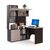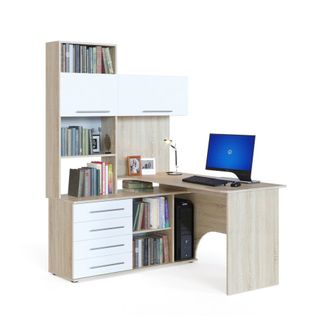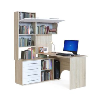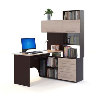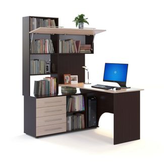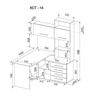 Многофункциональный рабочий модуль для домашнего кабинета или офиса. Модель сочетает в себе широкий компьютерный стол с размером столешницы 1400 мм, тумбу с ящиками, полками и нишей под системный блок. Высокая надстройка имеет открытые полки и два закрытых шкафа. Двери шкафчиков открываются вверх. Внутренний размер ящиков — 456 х 346 мм. Изделие выполняется из ЛДСП толщиной 16 мм, края обработаны кромкой ПВХ 0,4 и 2 мм. Задняя стенка — ДВП серого цвета. Стол может быть с правым или левым углом. Ориентация определяется по расположению надстройки.