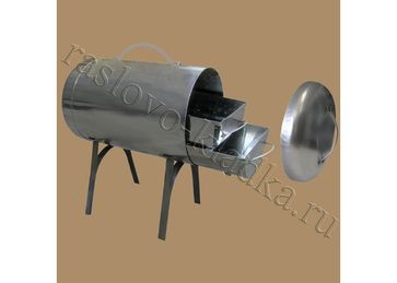 Коптильня из нержавеющей стали "Бочонок". Масса около 6 кг.Габаритные размеры, мм: длина-490; ширина (по опорным ножкам) - 230; наружный диаметр жаровни - 250; высота (с ножками)- 498 мм. None