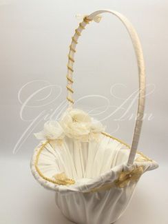 Корзинка для лепестков Gilliann Golden Time BAS014 Корзинка из коллекции Golden Time. Сделана из белого атласа, украшена тремя розами, сделанными из прозрачной органзы, отчего они кажутся пышными, воздушными. Края корзины отделаны жемчугом и золотистым шнурком, он же переплетает ручку до середины. Края шнурка закреплены бантами из органзы с жемчужиной посередине. У корзины отогнуты края, такая форма удобна, чтобы доставать пригоршни лепестков и бросать их в молодоженов. Красивая, изящная корзинка, сделанная с большим вкусом, украсит любую свадьбу. Материал и декор: атлас, органза, жемчуг, декоративные элементы. None