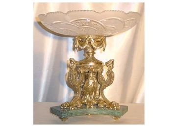 Хрустальное блюдо укреплено на бронзовом основании в виде трех декоративных мотивов, так называемых «эспаньолет» (изогнутых волют, увенчанных женской головкой, с опорой в виде когтистой лапы). Между ними изображены птицы – три кукушки. Вольная интерпретация западноевропейских образцов второй половины ХIХ века в стиле историзм. Кукушка – символ гадания, предсказания будущего, знак наступающей весны. В античном искусстве кукушка изображалась на скипетре богини Геры, поскольку Зевс, чтобы соблазнит None