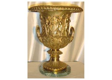 На камне размещена ваза из позолоченной бронзы, по форме напоминающая древнегреческую, выполненную в стиле ампир. Ножка украшена каннелюрами (желобками), тулово имеет интересную форму, с двумя ручками. Незатейливый растительный орнамент из завитков, листьев аканта, вьющихся стеблей, а также фигуры мифологических героев декорируют вазу. Край тулова заканчивается рифленым бортиком. None