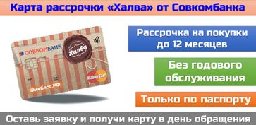 "Халва" - пластик от компании "Совкомбанк". Он позволяет своим держателям приобретать товары по беспроцентному кредиту, т.е. в рассрочку.