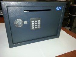 Предназначен для хранения документов и незначительных ценностей в офисе, есть отверстие для закладки денег в сейф без возможности доступа кассира к содержимому. Корпус изготовлен из стального листа толщиной 2 мм, толщина лицевой панели 4 мм. Дверь запирается электронным замком с возможностью настройки кодовой комбинац None