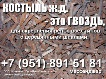 Костыль путевой ж.д. Костыль скрепляет рельсы всех типов с деревянными шпалами с применением подкладки. Подкладка устанавливается между шпалой и рельсом и имеет технологические сквозные проёмы соответствующие габаритам костыля. Именно в эти проёмы забивают ж.д костыли. Костыль имеет особую конструкцию, которая предусматривает смещение шляпки в одну строну и надежно прижимает подошву рельса к шпале. Средний расход костылей на 1 км пути составляет 1600 шт.