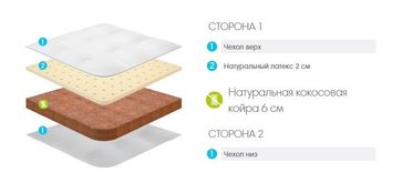 Двусторонний матрас Latex-Cocos Light сочетает слои натурального латекса и пролатексированной кокосовой койры. Для здорового отдыха и сна новорожденного ортопеды рекомендуют жесткие наполнители. Пролатексированная кокосовая койра обладает высшим уровнем жесткости (5 из 5) и получила одобрение педиатров за лечебно-профилактические возможности. Умеренно-жесткий слой из латексного монолита подходит как младенцам, так и малышам постарше. Оба наполнителя изготовлены из натурального, гипоаллергенного, антибактериального сырья.Кол-во пружин на м2: БеспружинныйДлина (см): 160/190/195/200Ширина (см): 80Высота (см): 8Жесткость (сторона 1): Выше среднейЖесткость (сторона 2): ВысокаяМаксимальная нагрузка на одно спальное место (кг): 60Ткань чехла (по умолчанию): Детский поликоттон (100 г/м2)Основа: Натуральная кокосовая койра 6 см Минимальная сумма заказа 1000 рублей. Страна производства: Россия Возможен самовывоз.