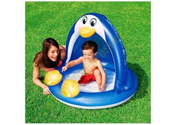 Этот миниатюрный игровой комплекс-бассейн, выполненный в виде забавного пингвиненка, предназначен для самых маленьких. Надувной тент защищает малыша от прямых солнечных лучей. Через низенькие борта удобно перелезать, а надувное дно обеспечит малышу 1-3 лет полную безопасность. Размер: 10210283см. None