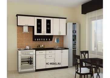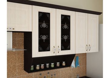 Материал: Корпус-ЛДСП, цвет венге. Фасад-МДФ, цвет млечный дуб. Столешница 38мм, цвет венге. Ручка дуга металл. Цоколь в цвет корпуса. Стекло витраж
