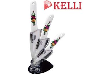Набор керамических ножей Kelli (Келли) KL-2043 Керамические ножи Kelli KL-2043 из 4 пр. - Материал: ножа циркониевая керамика - Керамические белые лезвия - Ручки ножей из натуральной керамики - Нож поварской -15 см - Нож универсальный -12,5 см - Нож для чистки овощей - 10 см - Эффектная подставка для ножей - Подарочная упаковка None