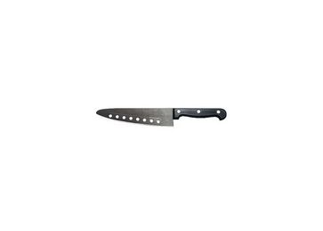 Нож поварской, аналогичный модели 79113. Нож имеет очень широкую сферу применения: шинкование овощей, разделка мяса и т. д. Тефлоновое покрытие полотна и технологические отверстия на отфрезерованной части лезвия облегчают рез, увеличивают его эффективность и исключают прилипание продуктов к полотну. Имеется прямолинейный барельеф вдоль всего полотна, за счет которого исключается прилипание отрезанного продукта к лезвию ножа. Кончик полотна ножа закруглен, что позволяет не отрывать нож полностью от разделочной доски при шинковании овощей и фруктов. Длина лезвия 180 мм. Полотно ножа толще, чем у ножа арт. 79113. Рукоятка — из ударопрочного пластика с защитной кулисой для пальцев. None