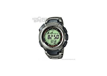 Коллекция: PRO-TREK Корпус: Титан Гарантия: 1 год. Комплектация: часы, фирменная упаковка, инструкция, гарантийный талон. Особенности:Многофункциональные часы для туризма. Полностью автоматическая электролюминесцентная подсветка с автоматической активацией при и тусклом, неясном свете и выключением подсветки при достаточном освещении. Подзарядка аккумулятора от энергии солнечного света. Автоматическая коррекция показаний по радиосигналам точного времени. Барометр: встроенный датчик давления для измерения барометрического давления. Встроенный датчик температуры. Встроенный цифровой компас. Альтиметр: встроенный датчик барометрического давления с возможностью вывода результатов в единицах высоты над уровнем моря. Максимальная высота - 10000 метров над уровнем моря. Отображение величины изменения между стартовой и текущей позициями над уровнем моря. Отображение текущего времени в основных городах и регионах мира. Секундомер с точностью показаний 1/100 сек и максимальным временем измерения - 24 час. Таймер обратного отсчета. 5 ежедневных будильников. Индикатор уровня зарядки элемента питания. Автоматический календарь. Модуль часов рассчитан на работу при низких температурах. Минеральное стекло устойчивое к возникновению царапин. Литой титановый браслет. Размеры корпуса 47,7 мм (по оси заводной головки) х 56,9 мм (по вертикали) х 11,5 мм (толщина) / 60 грамм. None