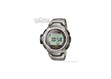 Коллекция: PRO-TREK Корпус: Пластик Гарантия: 1 год. Комплектация: часы, фирменная упаковка, инструкция, гарантийный талон. Особенности:Многофункциональные часы для спортивного туризма. Полностью автоматическая электролюминесцентная подсветка с автоматической активацией при тусклом, неясном свете и выключением подсветки при достаточном освещении. Автоматическая коррекция показаний по радиосигналам точного времени. Подзарядка аккумулятора от энергии солнечного света. Альтиметр: встроенный датчик барометрического давления с возможностью вывода результатов в единицах высоты над уровнем моря. Максимальная высота - 10000 метров над уровнем моря. Барометр: встроенный датчик давления для измерения барометрического давления. Встроенный датчик температуры. Отображение текущего времени в основных городах и регионах мира. Секундомер с точностью показаний 1/100 сек и максимальным временем измерения - 24 час. Таймер обратного отсчета. 5 ежедневных будильников. Автоматический календарь. Модуль часов рассчитан на работу при низких температурах. Минеральное стекло устойчивое к возникновению царапин. Корпус из стали и пластика. Титановый браслет. Размеры корпуса 50,3 мм (по оси заводной головки)х45,0 мм (по вертикали) х 11,6 мм (толщина) / 89 грамм. Надежный браслетный замок с тройным сгибом. None