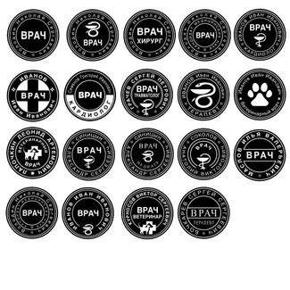 19 профессиональных макетов печатей врача, ветеринара - в формате Corel DRAW версии X3 и выше (в шрифтах). Для изготовления печатей на фотополимере. Макеты в негативном отображении. Использованы шрифты семейства Helios, AdverGothicCTT и Arial. Диаметр печати врача: 30 мм