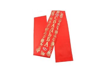 Лента "Свадьба" - красная STA476 Свадебная лента для украшения машины. Сделана из красного шелка, надпись "Свадьба" и орнамент нанесены золотой краской. .Размер: 15х160 см. Материал: шелк. None