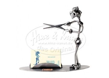 ПАРИКМАХЕР подставка для визитокСувенирная продукция немецкой фирмы HINZ&KUNST в стиле Hi-Tech, сделана с помощью лазера из металла, который не подвергается коррозии и не темнеет. Дизайнер коллекции - Гюнтер Шольц. Уникальность этой продукции заключается в том, что дизайнеру удалось с юмором воплотить в металле сцены из жизни. None