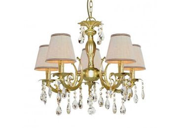 Материал арматуры:Металл, Материал плафона:Ткань, Цвет арматуры:Золото, Цвет плафона:Белый, Ширина (Диаметр), см:53, Высота, см:49, Площадь освещения, м.кв.:15, Количество ламп, шт:5, Тип цоколя:E14, Мощность, Вт:60W, Дополнительная информация:Подвески из хрусталя None