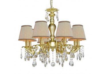 Материал арматуры:Металл, Материал плафона:Ткань, Цвет арматуры:Золото, Цвет плафона:Белый, Ширина (Диаметр), см:68, Высота, см:55, Площадь освещения, м.кв.:25, Количество ламп, шт:8, Тип цоколя:E14, Мощность, Вт:60W, Дополнительная информация:Подвески из хрусталя None