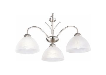 Максимальная площадь помещения : 13 м2Высота : 26 смМаксимальная высота люстры : 71 смМинимальная высота люстры : 50 смДлина/ширина конструкции : 56 смМатериал каркаса : МеталлЦвет каркаса : Матовое сереброМатериал плафона : СтеклоЦвет плафонов : АлебастрОбщая мощность : 180 ВтКоличество ламп : 3Мощность одной лампы : 60 ВтТип используемых ламп : Лампа накаливания, цоколь - 14ммКомплектация лампочками : Лампы в комплект не входят None