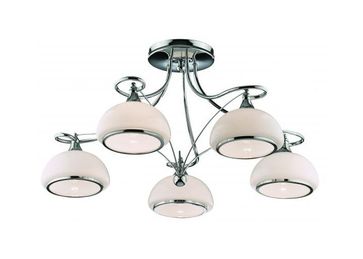 Материал арматуры:Металл, Материал плафона:Стекло, Цвет арматуры:Хром, Цвет плафона:Белый, Ширина (Диаметр), см:78, Высота, см:39, Площадь освещения, м.кв.:11, Количество ламп, шт:5, Тип цоколя:E27, Мощность, Вт:40W None
