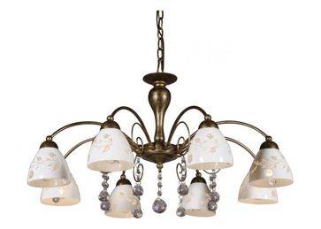 Материал арматуры:Металл, Материал плафона:Стекло, Цвет арматуры:Старинная бронза, Цвет плафона:Белый с узором, Ширина (Диаметр), см:75.5, Высота, см:43.3, Площадь освещения, м.кв.:20, Количество ламп, шт:8, Тип цоколя:E14, Мощность, Вт:40W, Дополнительная информация:Хрустальные подвески None
