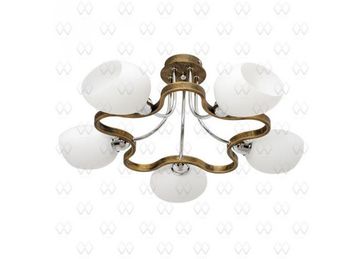 Материал арматуры:Металл, Материал плафона:Стекло, Цвет арматуры:Античная бронза/Хром, Цвет плафона:Белый, Ширина (Диаметр), см:50, Высота, см:27, Площадь освещения, м.кв.:10, Количество ламп, шт:5, Тип цоколя:E14, Мощность, Вт:40W None