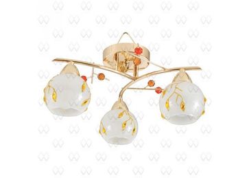 Материал арматуры:Металл, Материал плафона:Стекло, Цвет арматуры:Золото, Ширина (Диаметр), см:35, Высота, см:20, Площадь освещения, м.кв.:9, Количество ламп, шт:3, Тип цоколя:E14, Мощность, Вт:60W, Дополнительная информация:Декоративные элименты из стекла None