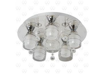 Материал арматуры:Металл, Материал плафона:Стекло, Цвет арматуры:Хром, Ширина (Диаметр), см:45, Высота, см:15, Площадь освещения, м.кв.:18, Количество ламп, шт:6, Тип цоколя:E14, Мощность, Вт:60W, Дополнительная информация:Плафоны из двойного декоративного стекла, хрустальные подвески. В люстре используется 2 режима освещения, дневное и светодиодное с синим свечением None