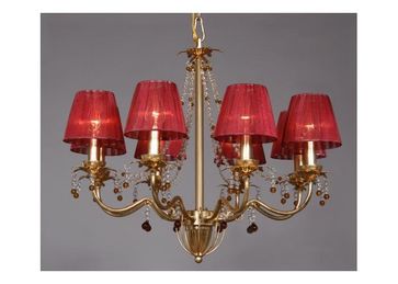 Материал арматуры:Металл, Материал плафона:Ткань, Цвет арматуры:Золото, Цвет плафона:Красный, Ширина (Диаметр), см:62.5, Высота, см:51.5, Площадь освещения, м.кв.:22, Количество ламп, шт:8, Тип цоколя:E14, Мощность, Вт:40W, Дополнительная информация:Стеклянные подвески None