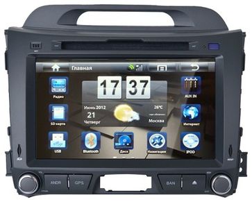 Штатный мультимедийный центр 4x45 Вт, тюнер (FM, СВ), встроенная память, CD, DVD, MP3, WMA, JPEG, Bluetooth, ТВ-тюнер, встроенный GPS-приемник, компонентный выход, разъем USB, KIA Sportage None