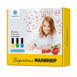 <p>С помощью набора "Бархатный маникюр" ты можешь сделать очень нежный, объемный и приятный на ощупь маникюр.</p> <p>Это очень оригинальный и стильный маникюр для самых больших модниц!</p> <p>Кроме того, маникюр, сделанный с помощью лаков из набора, является безопасным.</p> <p>Наши лаки имеют уникальную формулу, благодаря которой легко смываются водой</p> <p>Набор "Бархатный маникюр" дарит замечательную возможность освоить хитрости маникюра.&nbsp;Лаки из комплекта произведены по особой технологии - их легко смыть обыкновенной водой. Ребенок сможет тренироваться в свое удовольствие без малейшего вреда для здоровья.&nbsp;</p> <p>В комплект входят все необходимые для стильного маникюра инструменты: удобная широкая пилочка, три флакончика с лаком, блестки и наклейки. Для хранения маникюрных принадлежностей предусмотрен стильный мешочек.&nbsp;</p> <p>Осваивая тонкости маникюрного мастерства, девочка приобретает очень важные навыки и качества, среди которых аккуратность, внимание к собственной внешности, уверенность в себе. В будущем все это поможет ребенку стать привлекательной девушкой, которая умеет подать себя в обществе других людей.</p> <p><br /><br />Бренд: Intellectico<br />Материал: лак, полимерный материал, бумага<br />Размер: 0,05х0,15х0,16</p> Наличные, безнал., карты, эл. деньги, юр. лица Возможен самовывоз. Есть доставка.