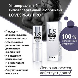 Осмельтесь на самые откровенные желания с Lovespray profi! Благодаря специальной формуле силиконовый лубрикант в форме спрея обеспечивает умопомрачительно долгое скольжение. Быстро и легко наносится на интимные зоны. Идеально подходит и мужчинам, и женщинам для любых видов интимной близости. <br><br> С Lovespray profi легко взять курс на оргазм и быстро достигнуть нужных «берегов». Особый состав спрея позволяет забыть об ощущении липкости и жирности. Огромный плюс спрея-лубриканта, что он гипоаллергенный, не содержит консервантов, без цвета и запаха. None