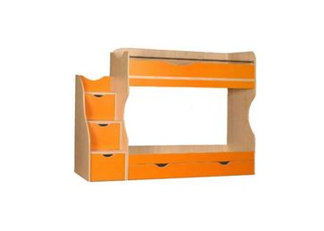 Детская комната Милена выполняется из двух цветов ламинированного ЛДСП, на фото представлена двуъярусная кровать Милена в цветофой гамме: оранжевый и клен. Для безопасности и защиты от падения ребенка для верхнего яруса кровати выполнен дополнительный бортик в виде хромированной металлической трубки, которая также вписывается в интерьер модели. Данный "бортик" может быть выполнен и для нижнего яруса кровати за дополнительную плату.