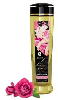 Массажное масло Aphrodisia с ароматом розы. 100% натуральные масла холодного отжима, с витамином Е (антиоксидант), без жирных остатков, не забивает поры, нет минерального или животного масла. <br><br> Мягкость и шелковистость этого масла с приятным скользящим эффектом на коже вызывает ощущение полного восторга. Сексуальное желание нарастает и вы готовы к любви. Получите взаимное удовольствие от чувственного эротического массажа с использованием нашей эксклюзивной смеси масел холодного отжима, тщательно отобранных за свои стимулирующие и придающие энергию свойства.<br><br> Масло легко скользит по коже, не оставляя жирных ощущений, в то время как различные экзотические ароматы поднимут ваши чувства до вершин возбуждения. Идеально подходит для того, чтобы насладиться расслабляющим массажем или сделать его, совместив с обволакивающими обольстительными ласками.<br><br> Это на 100 % натуральное масло с упоительным ароматом, легко скользит по коже, не оставляя жирной пленки. Запах массажному маслу придают эфирные масла и отдушки, что в отличие от большей части другой продукции SHUNGA, ароматизированной вкусовыми добавками, делает его несъедобным. None
