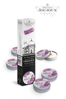 Чувственный массаж - лучшее начало эротического вечера! Просто подождите, пока массажная свеча расплавится и превратит воск в массажное масло, аромат Petits Joujoux Orient наполнит комнату свежестью, и наслаждайтесь волнующим массажем! <br><br> Масло разогревается, но не обжигает - распаляя ваши тела и пробуждая желание! Воск на основе натуральных ингредиентов (масло жожоба, масло дерева ши, оливковое масло, кокосовое масло) прекрасно ухаживает за вашей кожей, увлажняет ее и придает телу приятный нежный аромат. Время горения каждой свечи - 6 часов.<br> В упаковке 5 свечей по 33 гр. каждая. None