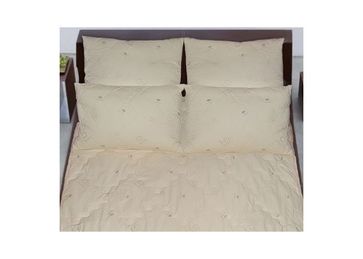 Ткань чехла - бежевый тик с изображением овечек. Подушка - комбинированная - чехол простеган с шерстью овцы, внутреннее ядро - шаровое силиконизированное волокно. Упаковка - чемодан спанбонд ПВХ None