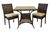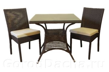 Комплект плетеной садовой мебели выполнен на алюминиевом каркасе в комбинации с плоским плетением из искусственного ротанга коричневого цвета. В комплект мебели входят: 1 стол и 2 стула.