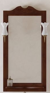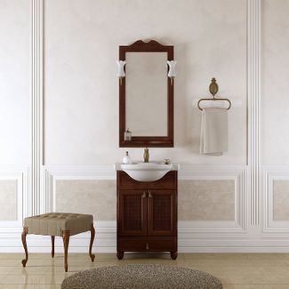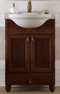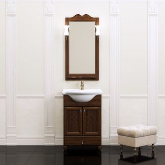Мебель выполнена в классическом стиле, выпускается из массива бука в цвете орех антикварный, размером 50 см. Удобная, красивая, функциональная и защищенная от воздействий влаги – эта мебель изумительно вписывается в интерьер. Комплект состоит из зеркала в деревянной раме с двумя изящными светильниками, тумбы с двумя открывающимися дверцами и декоративной решеткой и керамической раковины Дрея (Чехия). По вашему желанию комплект дополняется пеналом в двух цветах, состоящим из верхнего открывающегося фасада со стеклом в деревянной раме, двух выдвижных ящиков и нижнего открывающегося фасада с декоративной решеткой и бельевой корзиной. В зависимости от вашего пожелания пенал может быть как левостороннего, так и правостороннего открывания. Характеристики: Элементы корпуса: шпонированный или крашенный мдф Материал корпуса: ЛДСП Материал фасада: массив бука Материал раковины: керамика Форма мебели: прямоугольная Материал фурнитуры: бронза Размер тумбы: 560/880/450 мм Размер зеркала: 510/1035/120 мм Размер раковины: 560/180/420 мм Минимальная сумма заказа 1000 рублей. Страна производства: Россия Возможен самовывоз.