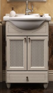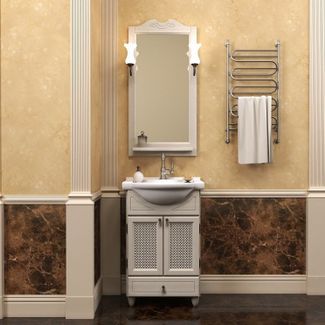 Мебель выполнена в классическом стиле, выпускается из массива бука в цвете орех антикварный, размером 50 см. Удобная, красивая, функциональная и защищенная от воздействий влаги – эта мебель изумительно вписывается в интерьер. Комплект состоит из зеркала в деревянной раме с двумя изящными светильниками, тумбы с двумя открывающимися дверцами и декоративной решеткой и керамической раковины Дрея (Чехия). По вашему желанию комплект дополняется пеналом в двух цветах, состоящим из верхнего открывающегося фасада со стеклом в деревянной раме, двух выдвижных ящиков и нижнего открывающегося фасада с декоративной решеткой и бельевой корзиной. В зависимости от вашего пожелания пенал может быть как левостороннего, так и правостороннего открывания. Характеристики: Материал корпуса: ЛДСП Элементы корпуса: шпонированный или крашенный мдф Материал фасада: массив бука Материал раковины: керамика Форма мебели: прямоугольная Материал фурнитуры: бронза Размер тумбы: 560/880/450 мм Размер зеркала: 510/1035/120 мм Размер раковины: 560/180/420 мм Минимальная сумма заказа 1000 рублей. Страна производства: Россия Возможен самовывоз.