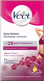 - Veet Easy Gelwax с Ароматом Бархатной Розы и Эфирными Маслами 1 пачка 14 восковых полосок + 4 салфетки по выгодной цене 325 р. руб.;