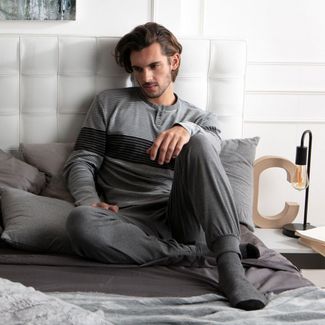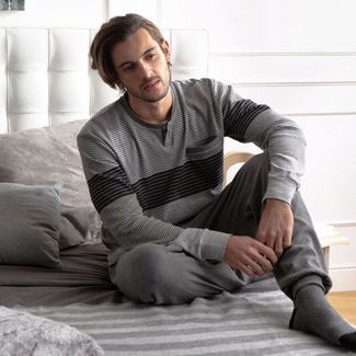 Мужской домашний костюм из плотного интерлока: полосатая блуза с застежкой на пуговицах в вырезе горловины и нагрудным карманом и гладкие брюки. Рукава блузы и края брюк отделаны манжетами. В комплекте: блуза, брюки. None