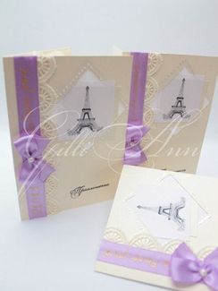 Приглашение на свадьбу Gilliann Paris INV004 Приглашения на свадьбу в виде складывающейся напополам открытки. Выполнены из дизайнерского картона в бежевых тонах с изображением символа Парижа - Эйфелевой башни. Украшены кружевом, сиреневыми атласными лентами, бантами с жемчугом. Идеально подойдут для романтической свадьбы во французском стиле, пронизанной атмосферой нежной влюбленности, утонченности, шарма и очарования. Гости уже с получением приглашений поймут, что на свадьбе их ждет что-то особенное и незабываемое. Материалы и декор: дизайнерский картон, атласные ленты, кружево, жемчуг. Размеры: любые Мин. заказ 500 руб.