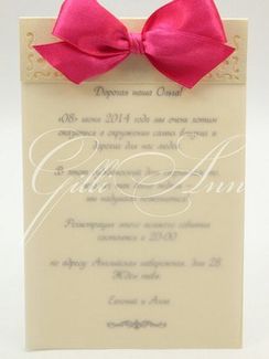 Приглашения на свадьбу Gilliann Crimson INV029 Невероятно романтичное приглашение на свадьбу. Подложка изготовлена из фактурного дизайнерского картона цвета айвори. Верхние уголки украшены красивыми вырубными узорами. Приглашение декорировано ярким объемным бантиком из атласной ленты малинового цвета. На подложке прикреплены 2 странички из белой кальки, на внутренней страничке размещен текст пригласительного письма. Пригласительное очаровывает своей лаконичностью и гармоничным сочетанием цветов и фактур, а также передает романтический настрой молодоженов. Материал: дизайнерский картон, калька, атласная лента. Размеры: 15см на 11см <!--SPEC_HTML_EDITOR_SELECTION_START--><!--SPEC_HTML_EDITOR_SELECTION_END--> Мин. заказ 500 руб.