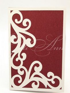 Пригласительные на свадьбу Gilliann Burgundy INV039 Элегантное пригласительное с изысканным резным декором. Изготовлено из дизайнерского картона двух цветов - белого и бордового. Обложка выполнена в виде рамочки, украшенной крупными белыми узорами. В центре рамочки - матовый картон бордового цвета. Текст пригласительного письма крепится внутри с помощью двух аккуратных цветков. Строгий лаконичный дизайн, крупный декор и благородный цвет приглашения наделяют его особым шармом и элегантностью. Приглашение подчеркнет цветовое решение Вашей свадьбы и не будет отвлекать получателя лишним декором от самого главного - текста Вашего письма. Смелый дизайн придется по душе молодоженам, предпочитающим индивидуальность и нестандартные решения. Материал: дизайнерский картон. Размер: 12 х 18 см Мин. заказ 500 руб.