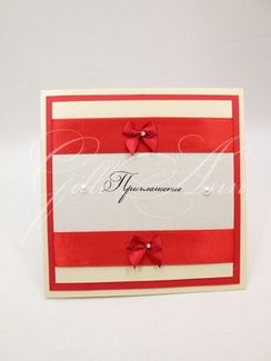 Пригласительные на свадьбу ручной работы Gilliann Perfect Red INV046 В ярких пригласительных на свадьбу Perfect Red соединились элегантность и торжественность. Необычное сочетание белых, айвори и красных тонов создает эффектный контраст, привлекающий внимание. Обложка декорирована атласными лентами и миниатюрными бантиками. Надпись "Приглашение" украшена двумя половинками перламутровых бусин. Внутри открытки размещается вкладыш, на котором будет напечатано ваше письмо и инициалы молодоженов. Такое яркое приглашение подскажет адресату, что свадьба будет оформлена в бело-красных тонах, а значит вечерний наряд должен быть соответствующим. В письме также может быть указан стиль торжества, например, ретро или классический красно-белый. Благодаря этому гости смогут заранее позаботиться о приобретении необходимых нарядов и чувствовать себя комфортно на вашем празднике. Материал: дизайнерская бумага, атласная лента, бусины. Длина - 15 см, ширина - 15 см <!--SPEC_HTML_EDITOR_SELECTION_START--><!--SPEC_HTML_EDITOR_SELECTION_END--> Мин. заказ 500 руб.