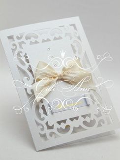 Пригласительные на свадьбу ручной работы со стразами Сваровски Gilliann Majestic INV053 Свадебные приглашения Gilliann Majestic - воплощение элегантности и классического стиля. Своим необычным дизайном обложка обязана вырубному рисунку, который наполняет открытку хрупкостью, воздушной легкостью. Романтичную нотку привносит милый кремовый бантик, а шика добавляют стразы Сваровски. Вместе эти элементы декора соединяются в прекрасное приглашение, которое очарует ваших гостей. Сквозь вырубной рисунок получатель увидит, что внутри скрывается письмо. Раскрыв пригласительный, он обнаружит вкладыш, на котором напечатан уникальный текст. Каким он будет - решать только вам. Напишите маленькую историю вашей любви, несколько теплых слов для будущего гостя или расскажите о стиле предстоящего праздника. С пригласительными ручной работы можно проявить фантазию и оригинальность в тексте. Материал: дизайнерская бумага, атласная лента, стразы Сваровски Размеры: высота: 17,5 см, ширина: 12 см Цена указана за одно приглашение без золочения. Мин. заказ 500 руб.